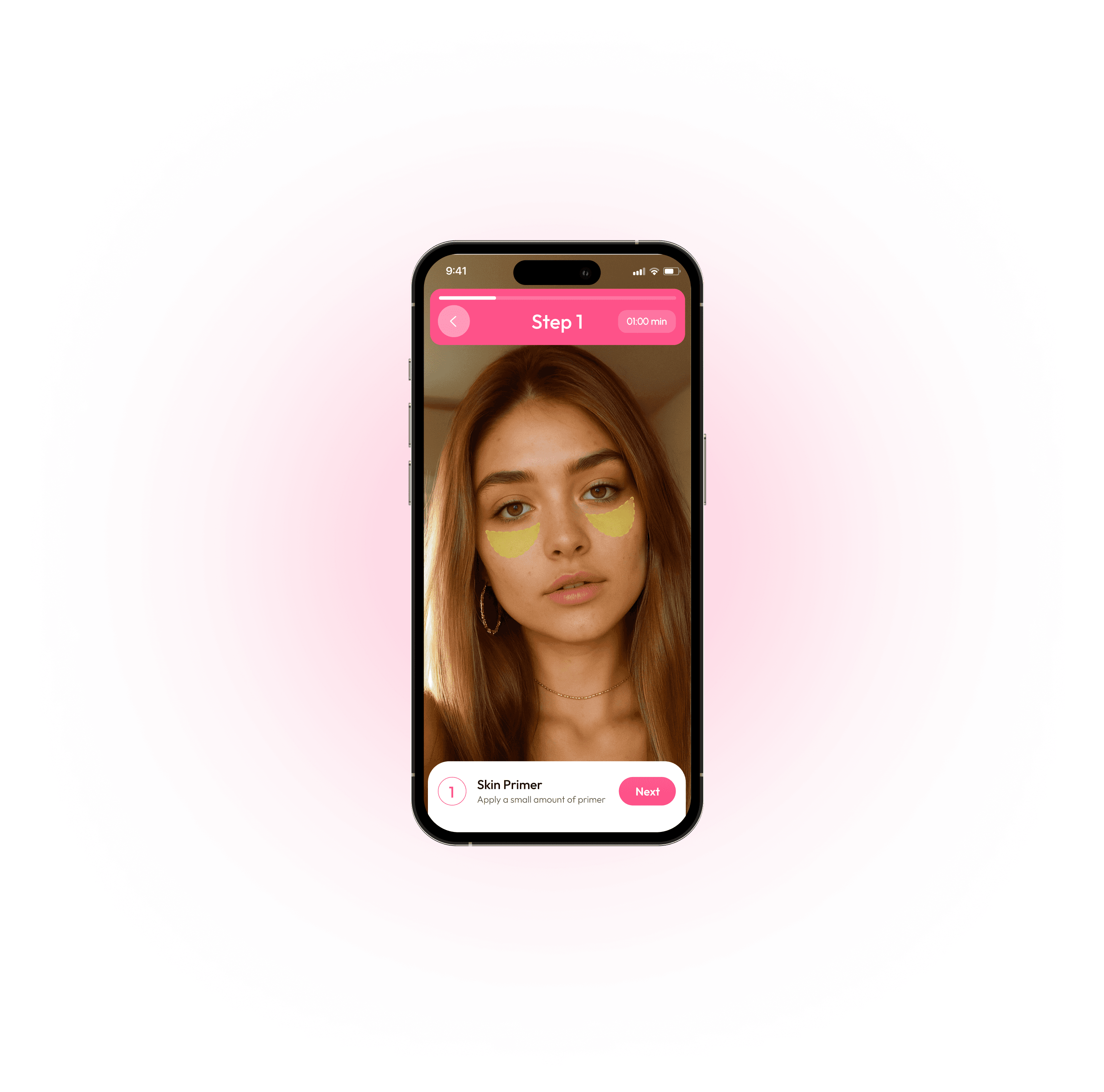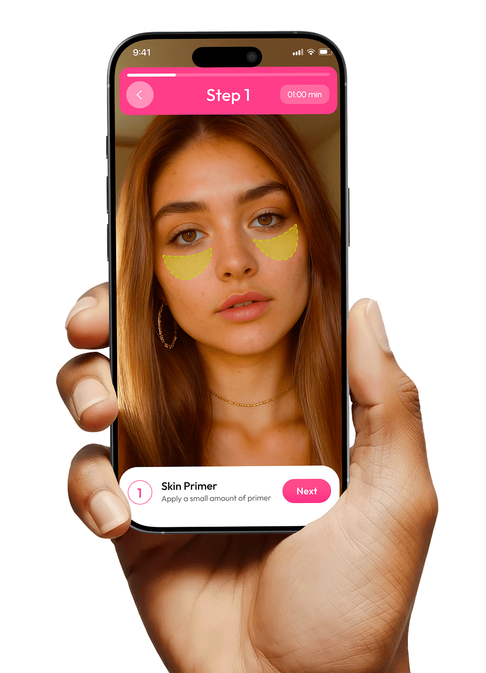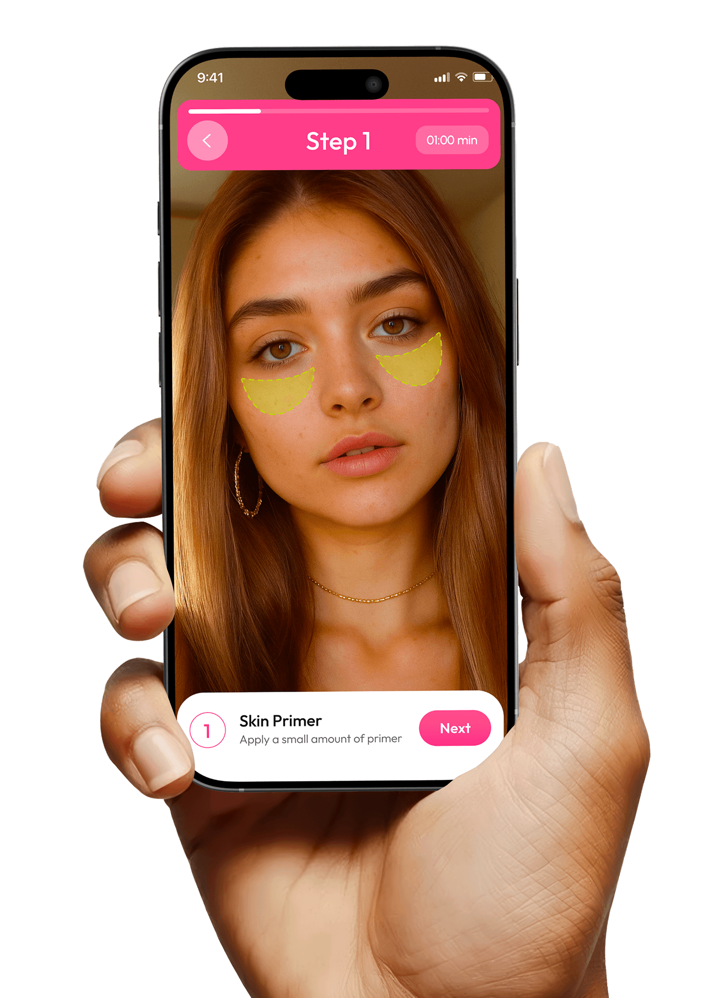 Your on-screen makeup coach guides you in real time. Hear voice tips, see AR overlays for exact placement, and track tools and products for every step.